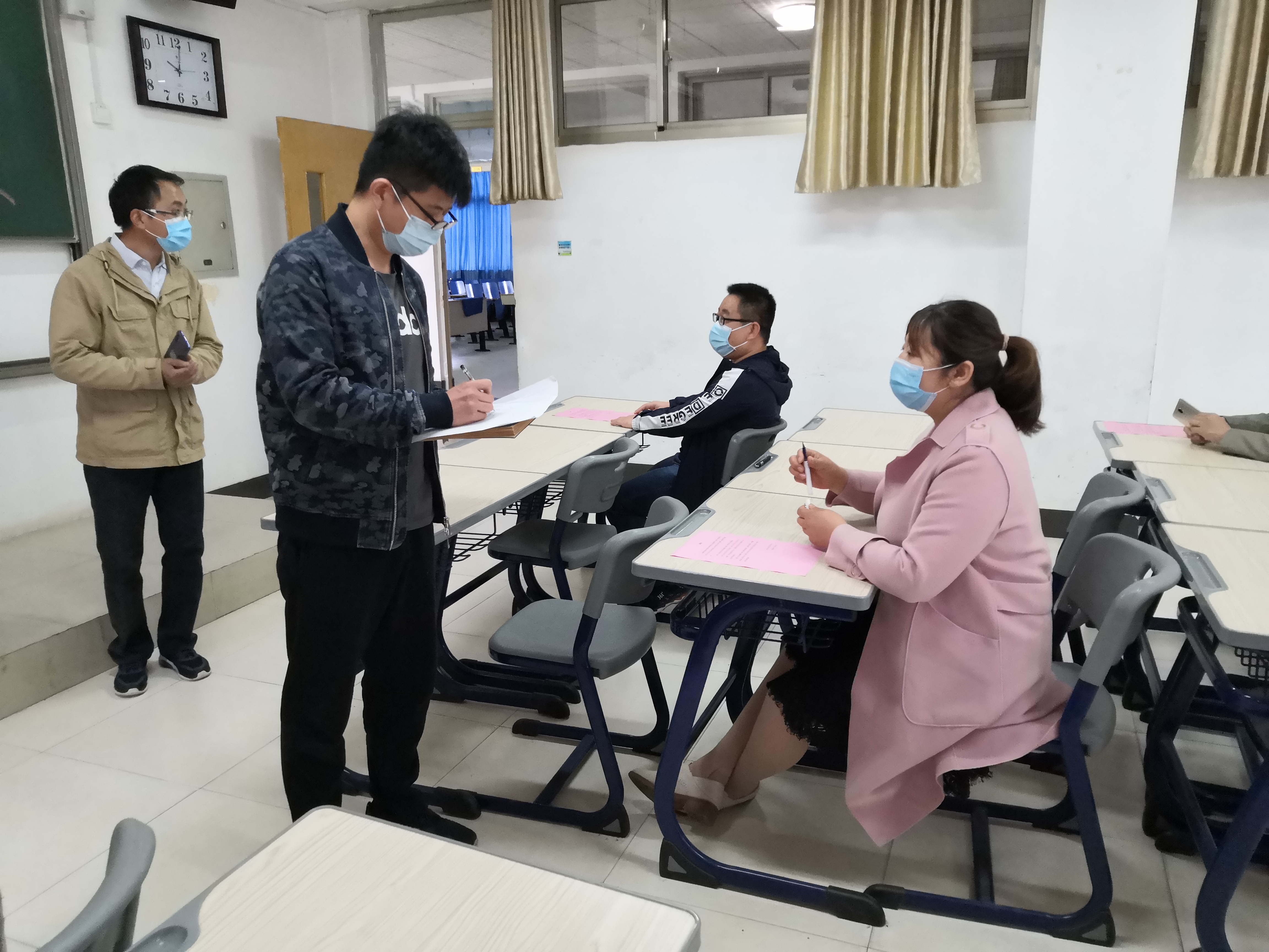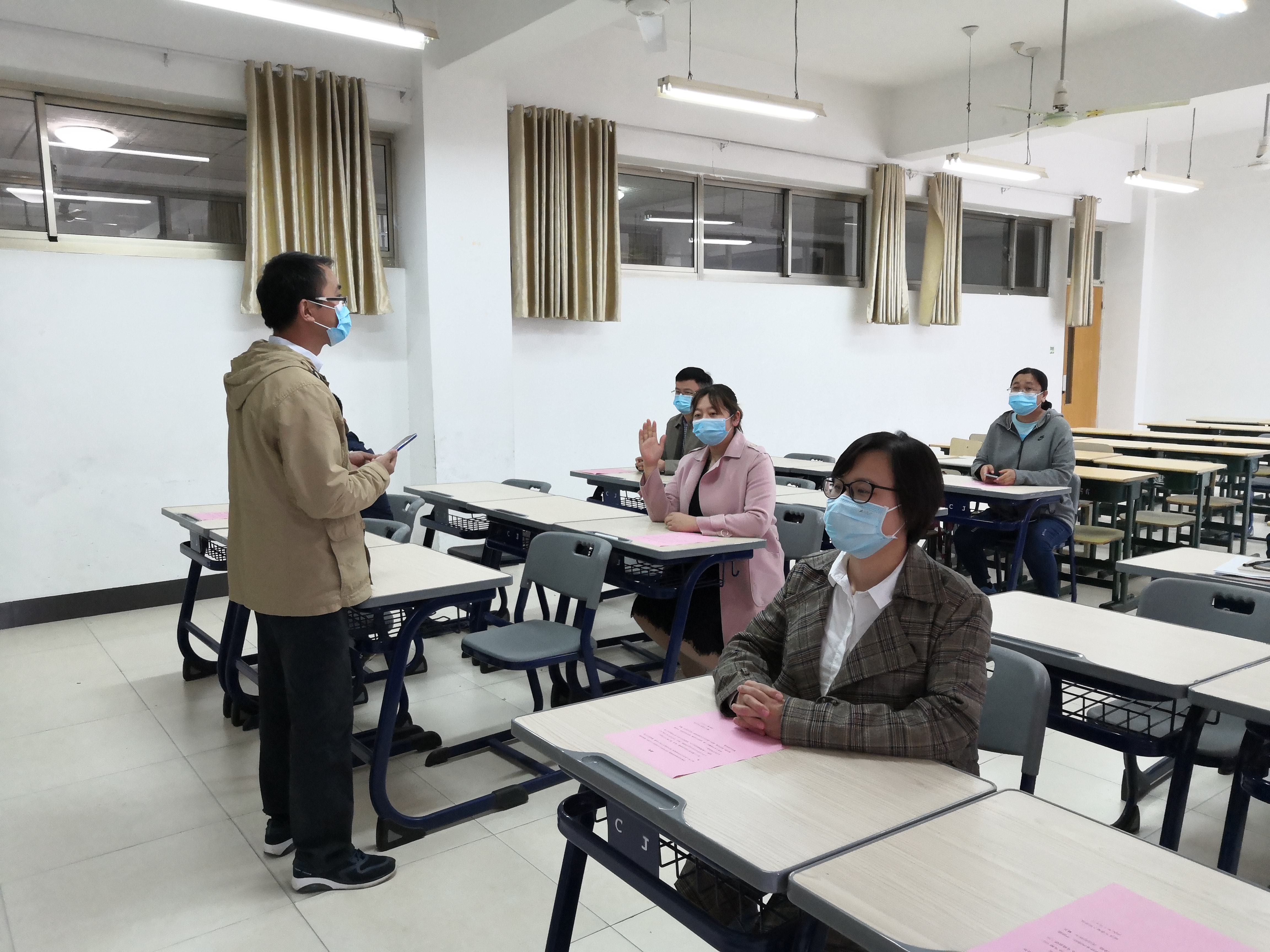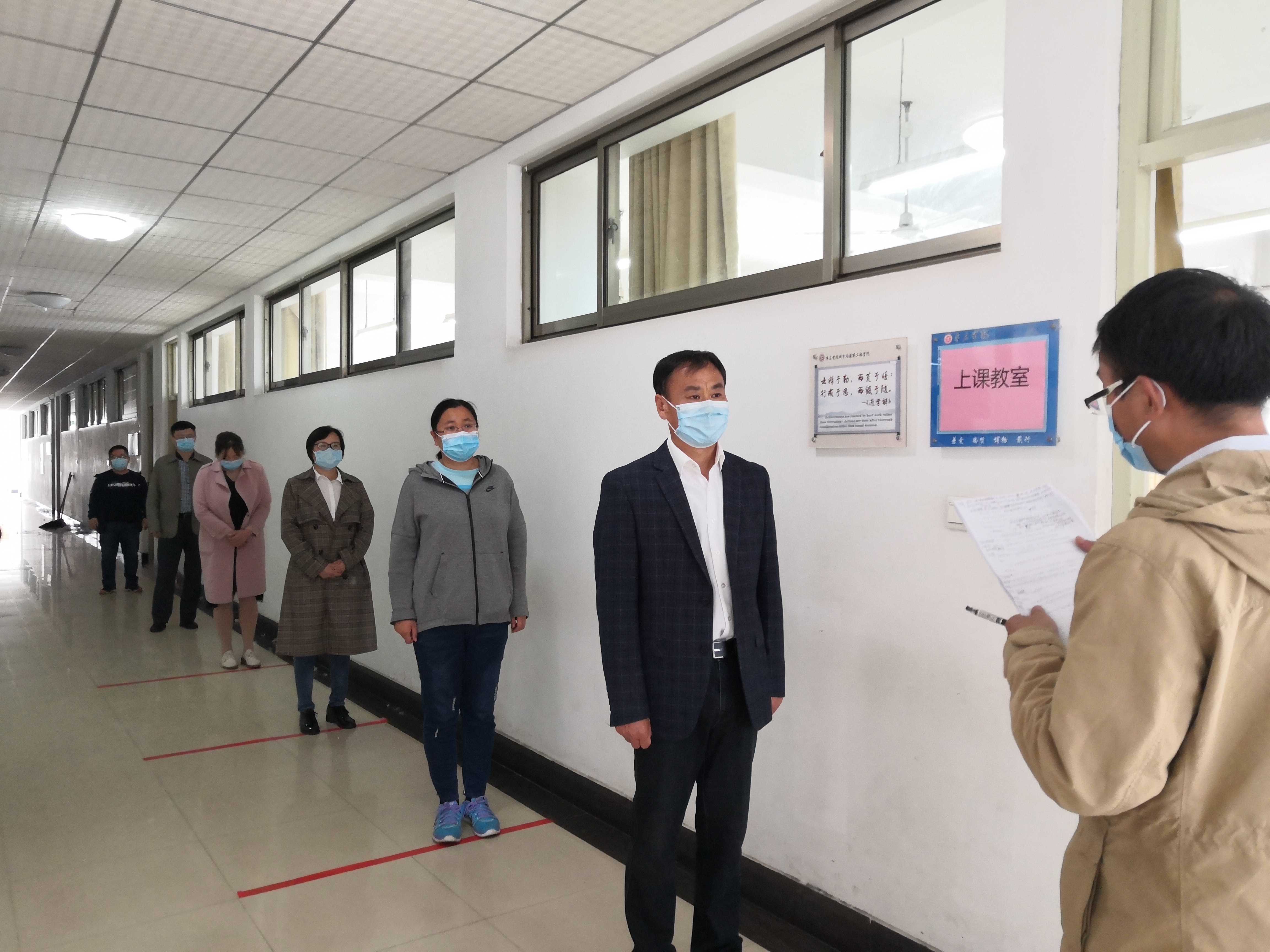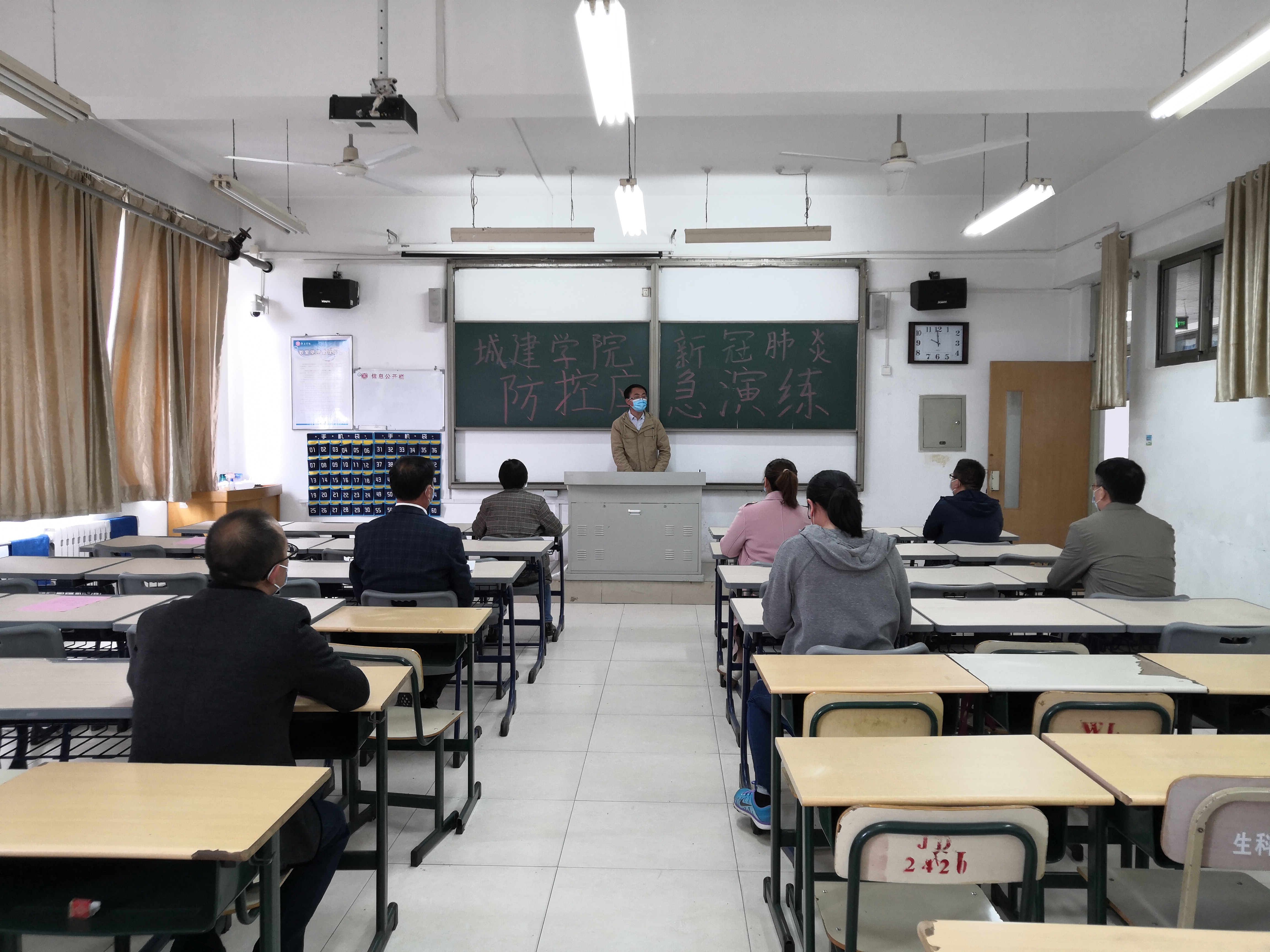 5月8日上午10点,演练正式开始。本次演练围绕教师上课期间学生发热及学生宿舍内发热两种场景两个场景展开,由学院新冠肺炎防控工作小组成员、部分教师按照应急演练方案分角色模拟演练。