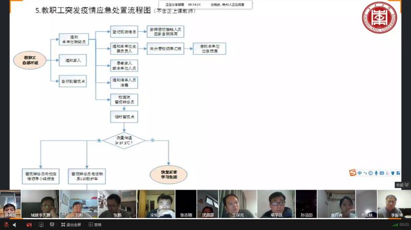 会议首先传达了学校对此次培训工作的要求,然后详细解读了《枣庄学院新冠肺炎防控应急处置培训手册》,围绕新冠肺炎基础知识、师生个人防护、应急处置流程等方面,对全院教职员工进行了系统的培训,并结合突发疫情应急处置流程图,重点讲授了教师个人安全、教室师生上课、学生宿舍、教职工突发疫情等场景下的应急处置流程和疫情处置关键人员分工及职责。会上,学院领导对全体教师提出了要求,希望全体教师提高站位,认真学习培训内容,积极配合学校做好开学核验工作,并要求全体教职工近期做好开学准备,严禁离开枣庄,并积极配合学院做好新冠肺炎防控应急演练工作和开学核验工作。