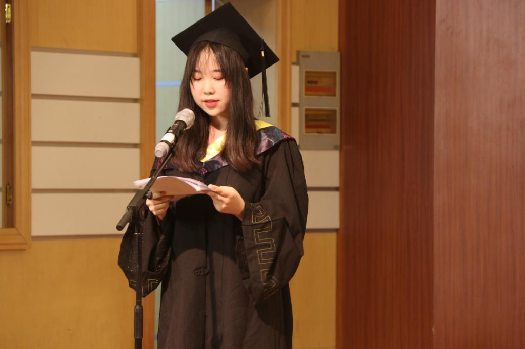 优秀毕业生代表张子涵同学在发言中表达了自己对老师和母校的感激、不舍之情。她在发言中提到:习近平总书记在今年纪念五四运动大会中曾讲到:“新时代中国青年,要有家国情怀,发扬中华文化崇尚四海为家、天下为公的精神。”借此展望未来,希望同学们无论是走向平凡的工作岗位,还是走在继续求学深造的路途上;无论是在发达的城市打拼,还是在偏僻的农村成为一名基层工作者,不管在哪里,都要不辜负母校的培养,不辜负老师的教诲,牢记“兼爱、尚贤、博物、戴行”的校训,做社会的栋梁,为枣院争光。