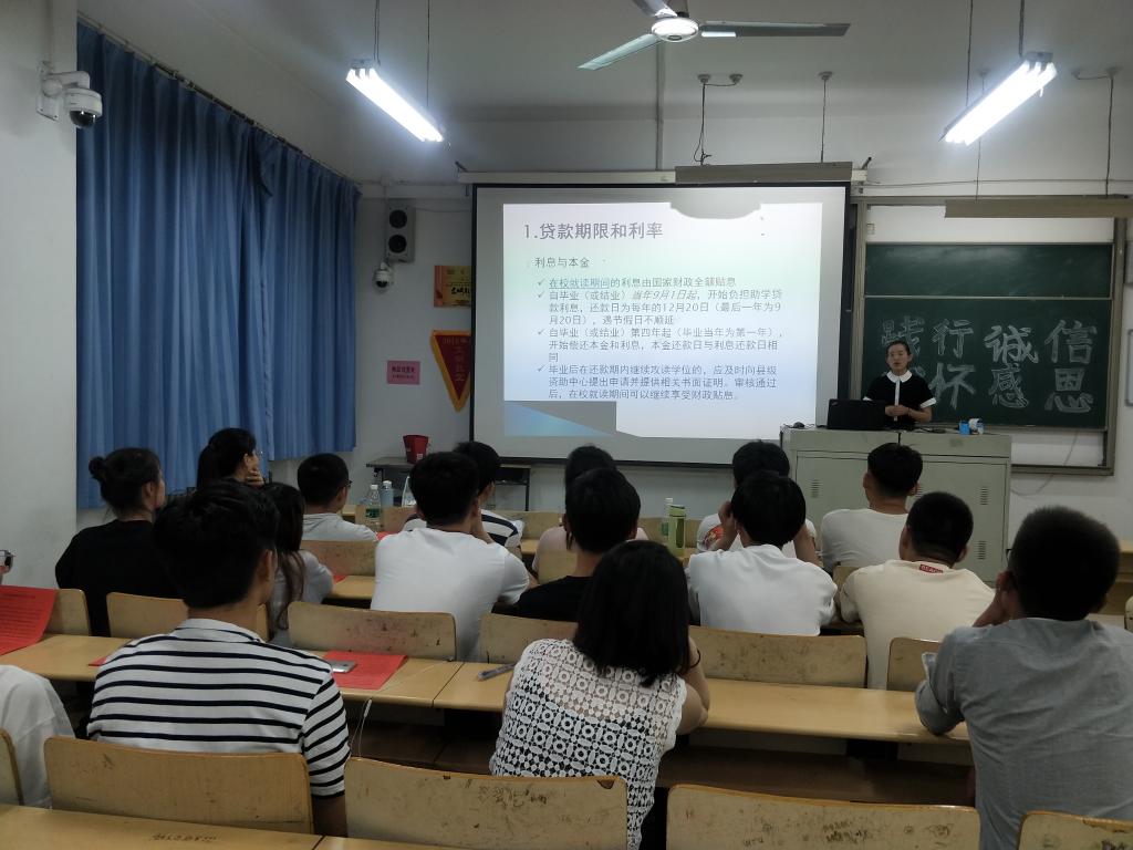 为进一步加强学生诚信教育,做好2019届贷款毕业生助学贷款工作,教育受助学生树立勤俭意识,珍惜国家、学校和社会的关心,强化资助育人效果,beat365平台唯一官网于6月4日晚在理工楼2318举行“践行诚信,心怀感恩”主题宣讲会。全体2019届贷款毕业生参加了此次宣讲会议。
