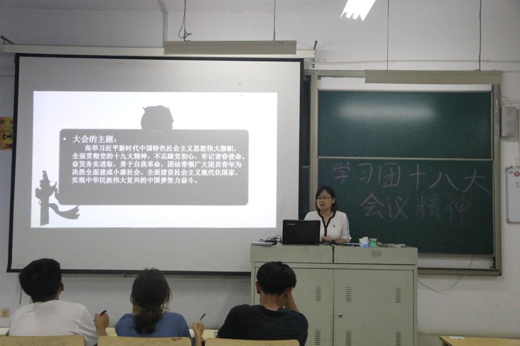 根据校团委相关工作要求,为第一时间传达团十八大精神,号召团员青年积极关注团的十八大,学习宣传贯彻团十八大精神,团总支副书记杜珊珊带领大家学习了王沪宁代表党中央发表的题为《乘新时代东风放飞青春梦想》的致词以及贺军科代表共青团第十七届中央委员会作的《中国共产主义青年团第十八次全国代表大会报告》,对大会的要点进行了讲解,向与会人员介绍了团的十八大的背景和意义,并对后续学习宣传贯彻团的十八大精神活动进行了安排部署。