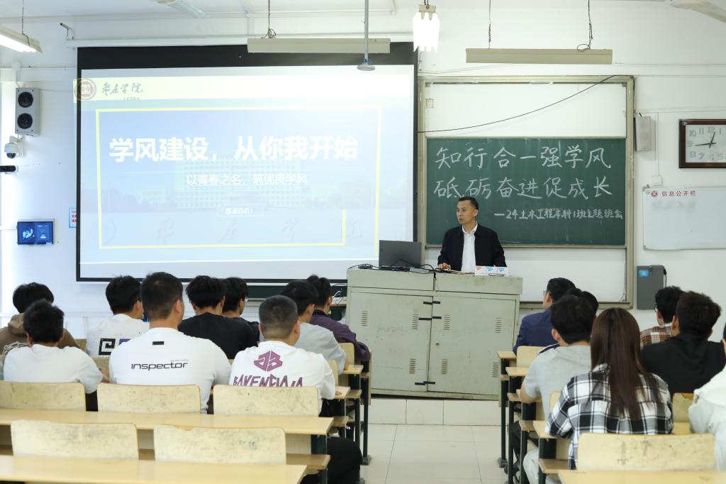 袁俊现在“知行合一强学风,砥砺奋进促成长”主题班会上,与同学们进行亲切交流,并结合自身学习工作经历,对同学们提出三点殷切希望:一是坚定理想信念,筑牢思想根基。鼓励同学们主动学习党的创新理论,将个人成长融入国家发展大局,通过主题团日、红色实践等活动厚植家国情怀,在价值塑造中锚定奋斗方向,以理想之光引领成长之路;二是强化能力提升,锤炼过硬本领。倡导同学们以专业学习为核心,积极参与学科竞赛、科研项目和社会实践,在 “学用结合” 中提升解决实际问题的能力。三是严守底线思维,涵养自律品格。引导同学们树立安全意识与法治观念,在学术研究、人际交往中恪守道德准则,保持清醒头脑,警惕成长路上的风险挑战,以慎独慎微的态度筑牢安全底线。