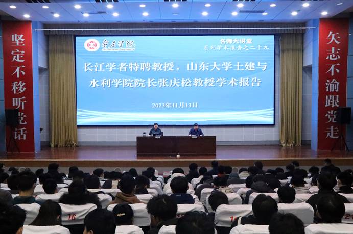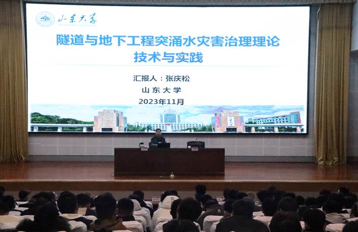 11月13日上午,beat365官网“名师大讲堂”系列学术报告第二十九讲在市中校区综合楼一楼报告厅成功举办。大讲堂邀请长江学者特聘教授、教育部新世纪优秀人才支持计划获得者、山东大学土建与水利学院院长、大型地下洞室群教育部工程研究中心副主任张庆松教授作学术报告。校党委委员、副校长李目海,党委委员、统战部部长、城建学院院长林勇出席报告会,城建学院全体教师及相关专业学生共200余人参加报告会。报告会由李目海主持。