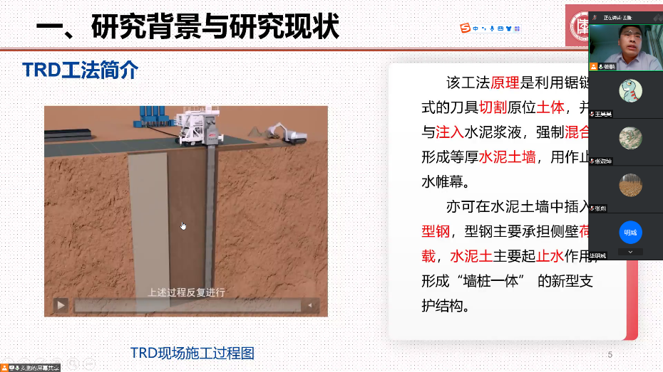 城市地下空间工程教研室姜鹏博士做了题为《TRD墙桩一体防渗与支护机理研究及应用》的学术报告,报告中详细阐述了等厚地下水泥土连续墙(TRD)工法的概况,以解决工程实际应用中面临的理论难题为出发点,以提高TRD工法施工质量、安全和经济性为目标,针对成墙质量影响机制、TRD混合模型试验和抗渗性分析、墙桩一体支护机理进行了研究,最终获得各关键参数的计算方法,形成了TRD工法墙桩一体的设计依据。报告结束后,参会教师就报告中的内容与热点问题展开热烈讨论,并结合各自研究领域互相交流研究心得。