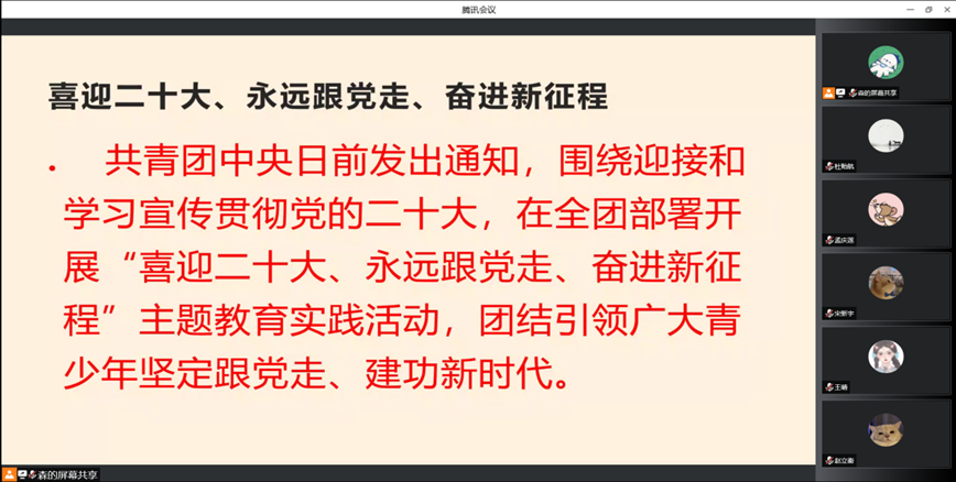 本次团课以各团支部为单位,由各班团支书组织开展线上活动。各团支书通过文件解读、相互讨论等方式让同学们深刻认识党的十八大以来党和国家事业取得的历史性成就、发生的历史性变革,以此增强同学们的爱国意识、民族自豪感和自信心。同时,组织观看《奋进新征程建功新时代》纪录片,激励同学们正确认识小我和大我的关系,以奋斗有我、不负青春的态度,树立远大理想,担当时代责任。