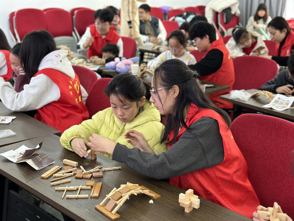 随后,大家通过亲手拼装鲁班锁、鲁班桥,感受榫卯结构的奥妙。活动中志愿者与社区青少年亲密互动,指导他们认识榫卯结构、搭建模型,并组织了一场别开生面的建构比拼,现场气氛热烈,欢声笑语不断。