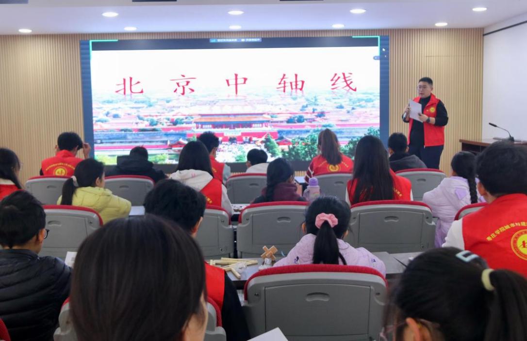 活动伊始,志愿者辛泓霖同学以“北京中轴线申遗成功”为切入点,生动详细地介绍了榫卯结构这一中国传统建筑的精髓。志愿者王延赫同学向孩子们展示了鲁班锁和鲁班桥构造和玩法,用通俗易懂的语言阐释班墨文化,发出保护和传承非物质文化遗产的号召。