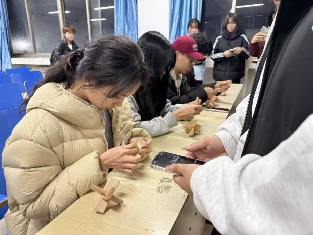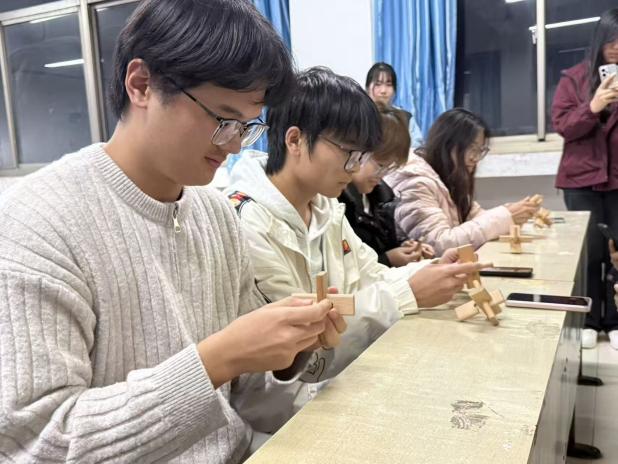 比赛分初赛与决赛两个环节,现场氛围紧张而热烈。初赛阶段,选手们专注拆解和组装低难度鲁班锁,指尖灵活翻飞,展现出高度的专注力与手脑协调能力,最终12名用时最短的同学脱颖而出,成功晋级。决赛中,高难度鲁班锁对选手的空间思维与耐心提出了更高要求,大家凝神聚力、巧思拆解、精准拼接,榫卯契合的声响交织成传统技艺的赞歌。整场比赛不仅是技艺的较量,更是对“精益求精”工匠精神的生动诠释。