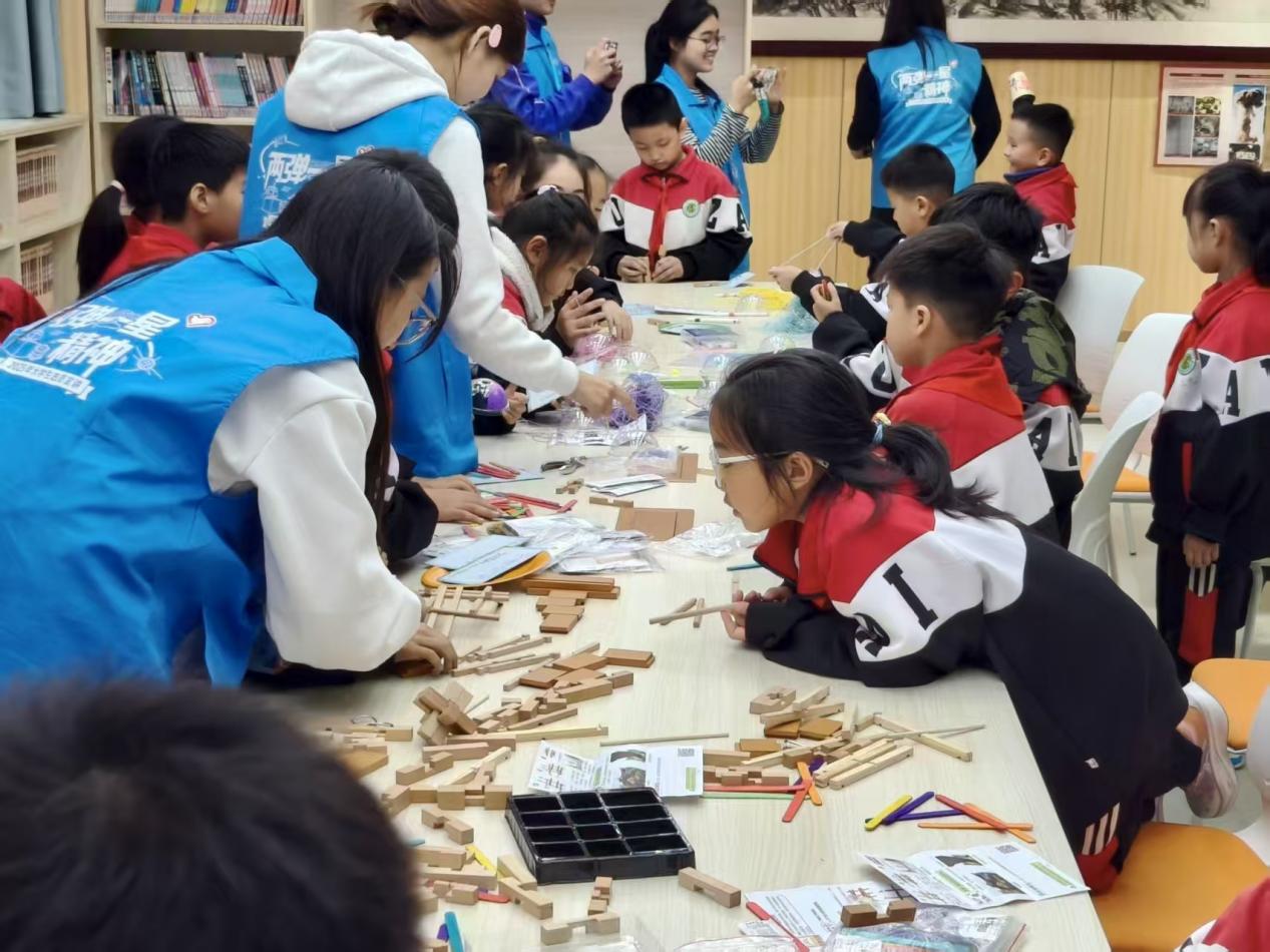 活动现场,党员们作为“志愿宣讲员”与“科普引路人”,通过丰富多样的形式传递知识与精神力量。趣味十足的“火箭升空小实验”,让孩子们在动手操作中探寻反冲力奥秘;甘肃北山“万年级”核废料处置工程的科学解读,结合科学家扎根戈壁的奉献事迹,让爱国坚守的精神浸润童心。拼搭“华龙一号”积木模型,直观展现大国重器的磅礴气势;解锁鲁班锁、搭建倍力桥、制作风铃、主题书籍阅读与益智绘画等环节,既让孩子们感受传统工艺与现代科技的魅力,又锻炼了动手能力与协作意识。互动交流中,志愿者们耐心解答疑问,引导孩子们写下心中梦想,让红色基因与科学精神在实践中生根发芽。