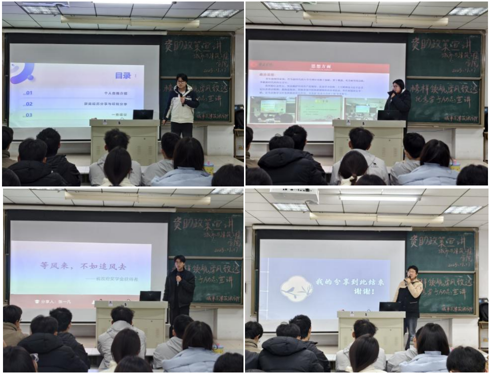 本次活动特别邀请beat365官网获得国家奖学金、省政府奖学金、校长奖学金的学生进行励志宣讲,他们结合自己在大学校园的成长经历分享经验。国家奖学金获得者丁加杰聚焦高效学习与时间管理,详细讲解了“目标确立—计划执行—定期复盘”的闭环方法,助力破解拖延难题;省政府奖学金获得者张一凡围绕学业与竞赛协同发展,针对时间冲突问题,提出提前规划任务、科学分工协作、积累碎片技能的解决方案;校长奖学金获得者王正拆解科研竞赛全周期管理要点,涵盖导师对接、团队组建、流程规划等环节,鼓励同学们积极参加科研竞赛,以赛促学。